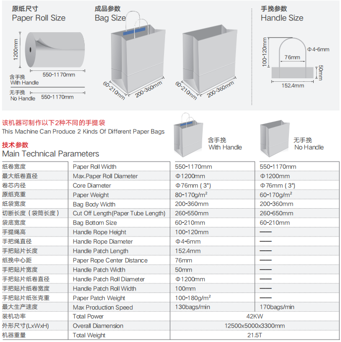 ZB1260S-450單張式全自動手提袋制袋機(自主創(chuàng)新),引進國際先進的生產(chǎn)工藝和管理體系,進行了自主創(chuàng)新。人性化智能操作界面,結(jié)合PLC和伺服控制系統(tǒng),使該機的技術(shù)性能和生產(chǎn)效率處于國際先進水平 。 ZB1260S-450單張式全自動手提袋制袋機是一臺手挽部分以圓繩為主的全自動手提袋,本機可生產(chǎn)三種袋型: